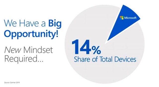 In a world where the proliferation of devices has exploded, there is no fundamentally new or surprising data that points to Microsoft having a reduced market share. HOWEVER for Microsoft to openly and candidly talk about only 14% market share is a major mental shift. This position is a completely at odds with Microsoft’s previous raison d’être.